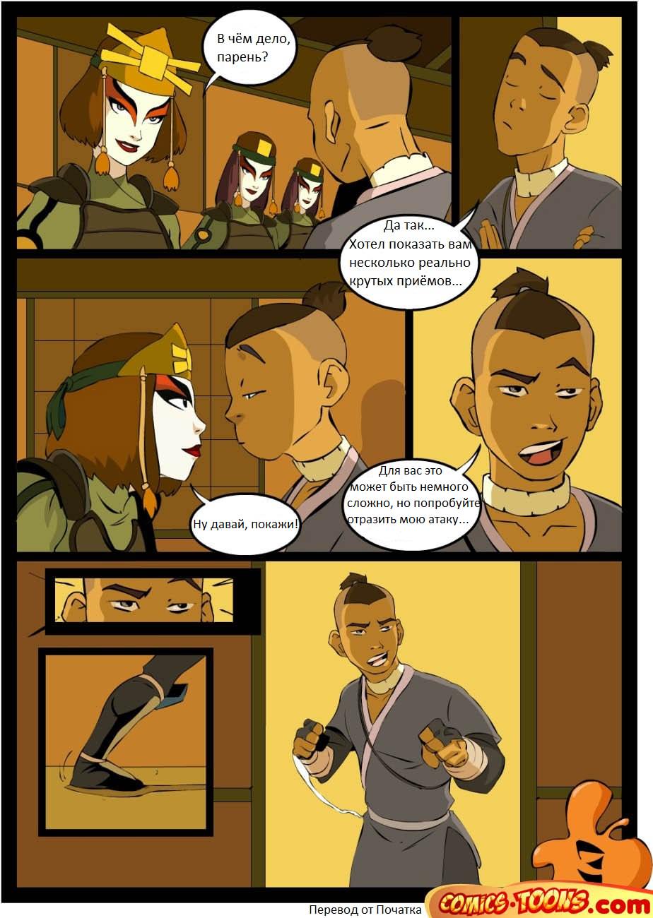 Сокка думал, что он несокрушимый воин, который не дрогнет перед лицом соперника никогда. Как же он ошибался! Стоило ему попасть в женский монастырь, где боевых искусствам обучали исключительно девушек, его защита пала. Как только он увидел голые сиськи, знания о защите и атаке вылетели из его головы. Его повалили на спину и стянули с него трусы так быстро, будто он никогда и не изучал искусство ведения боя. Вот только непонятно: его победили или он одолел сразу трёх противников? Ведь оргазмы получили все четверо!