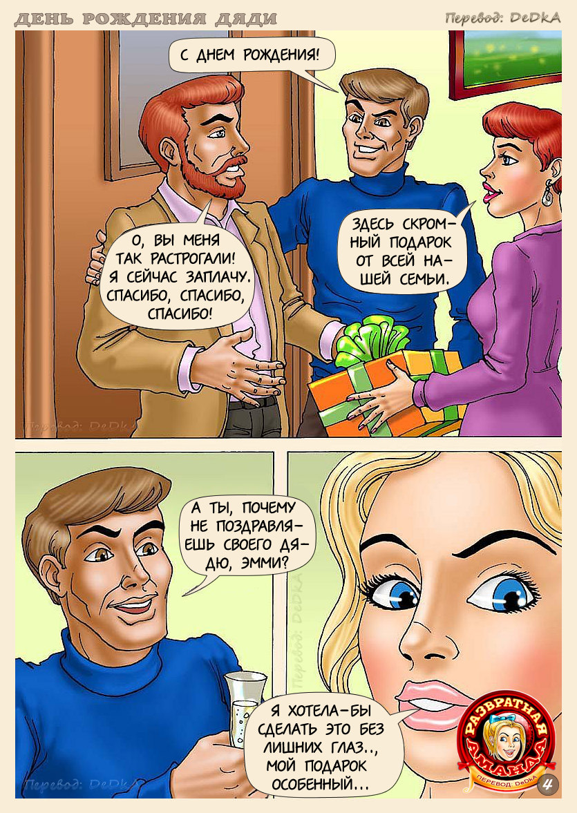 День рождения дядиДень рождения дяди 10.12.2024 Комментарии Нет комментариев Инцест, Секс комиксы Молоденькая племянница Эмми едет со своим братом и родителями на день рожденье дяди. Все поздравляют бородатого именинника, желают ему счастья, а блондинка Эмми сообщает дяде, что у нее особенный для него подарок, и что им необходимо уединиться. Телочка сначала достает коробку, завернутую в зеленый бант, но тут же приспускает свое эротичное голубое платье и намекает дяде на то, что самое время трахнуться. Давалка делает родственничку замечательный блоуджоб, от которого его член увеличивается в размере, а потом отрывается с любимым дядей полной программе! Комиксы по теме: Секс втроемМуж и его жена (сексапильная блондинка) не могут получить удовольствие от секса друг с другом… Секс-автобусОтличный комикс для тех, кто любит порно комиксы аниме! Обычный день в обычном автобусе –… ВоспоминаниеСегодняшней ночью знойная Бренда дома абсолютно одна. Неожиданный звонок принес ей неприятные новости - сегодня… ЙокогамаБлижайшее будущее. Постапокалиптичный город, в котором почти не осталось людей. Юная девушка Альфа случайно находит… ДжимМуж в отъезде, сын в своей комнате – кажется, эту мрачную бурю нашей героине предстоит… Месть через сексКлара каждый день мечтает о диком и необузданном сексе - не каждый мужчина способен дать… Стриптизёрша секс комиксДейв обсуждает с двумя стриптизершами планы на сегодняшний вечер, и, конечно же, амплуа девушек, с… Секс втроемМуж и его жена (сексапильная блондинка) не могут получить удовольствие от секса друг с другом… ↓↓↓ Ништячки! ↓↓↓ Поделись комиксом с друзьями! Как вам комикс? Оцените по 10-бальной шкале! (61 оценок, среднее: 7,33 из 10) Добавить комментарий Отменить ответВаш адрес email не будет опубликован. Обязательные поля помечены *Комментарий *Имя * Email * Сохранить моё имя, email и адрес сайта в этом браузере для последующих моих комментариев.