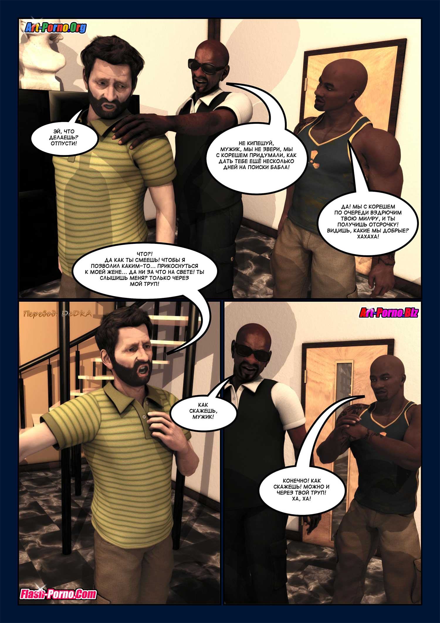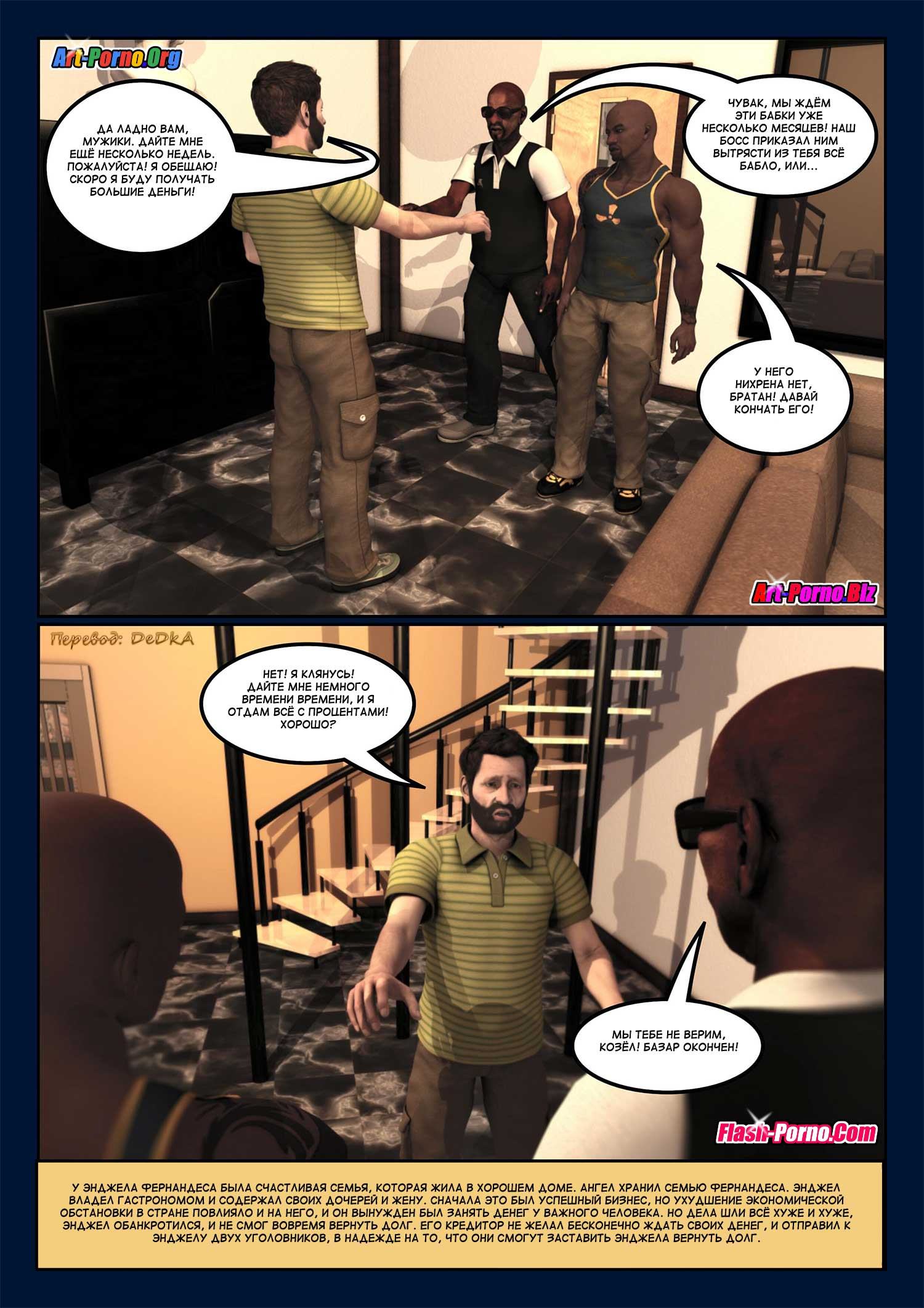 В своей квартире всегда чувствуешь защищенность – но это не касается семьи Энджела. Увы, он задолжал крупную сумму ростовщикам, и теперь ему нужно очень быстро найти деньги. Бандиты уже готовы растерзать должника – но неожиданно они замечают полуголую жену Энджела – она спускается со второго этажа и хочет узнать, что это за люди в её гостиной и почему они угрожают мужу. Находчивые бандиты – не кровавые убийцы, поэтому они милосердно предлагают Энджелу один очень хороший способ получить отсрочку по долгу. А учитывая, что на втором этаже дома притаились ещё и две очаровательные дочки Энджела – отсрочку можно даже увеличить.
