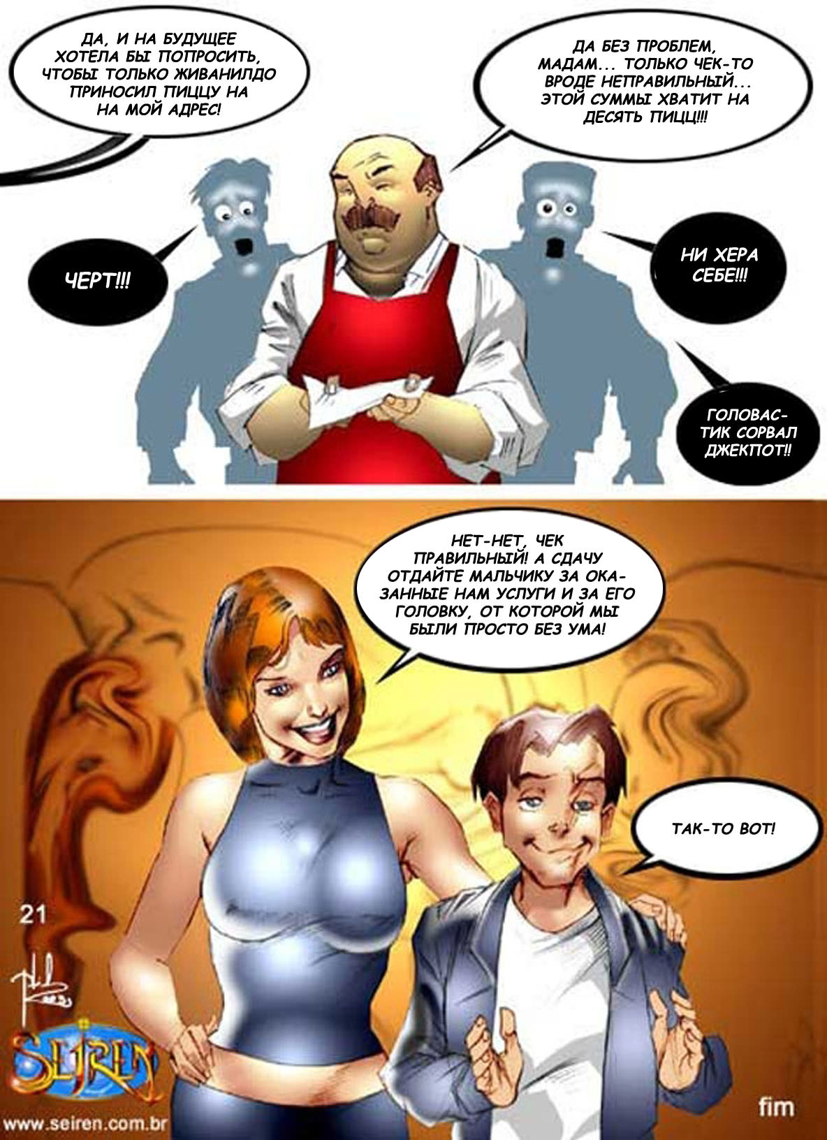 Внешность бывает обманчива – хорошо, что опытные дамы это знают и никогда не судят о мужчинах и парнях по первому взгляду. В этот вечер пиццу заказали как раз такие опытные дамы – их скучный досуг несколько разнообразил визит курьера. Пиццу полураздетым дамочкам принес молодой парень по прозвищу «Головастик».  Опыт не подвел красоток – они решают посмотреть, на что способен этот «головастик». Надо сказать, что леди не пожалели о своём чрезмерном любопытстве – оказалось, парню есть, что показать. Он, конечно, держался молодцом, но деньги за пиццу взять забыл…