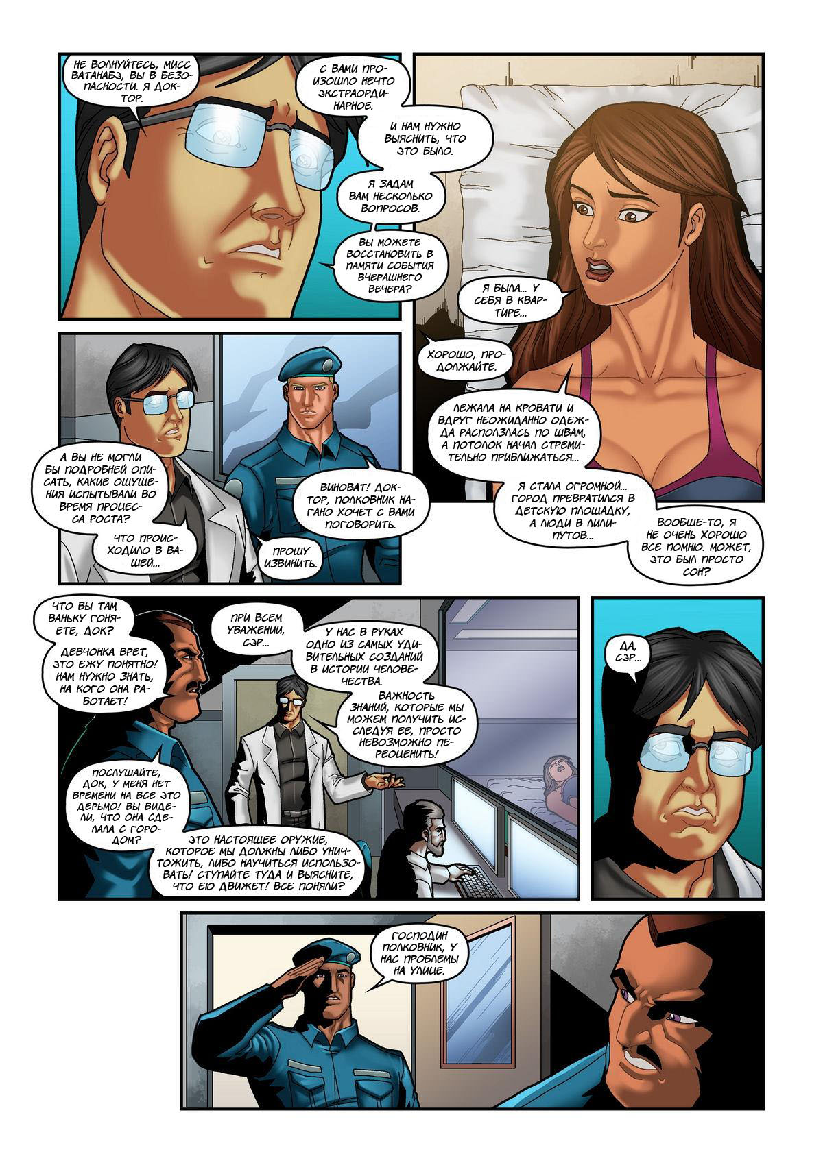 Сисястая шатенка Мисс Ватанабэ приходит в себя на больничной койке (прикованная к ней), а какой-то док расспрашивает ее о том, что было с ней вчера и просит ее волноваться. Тут дока вызывают к полковнику, который требует у врача узнать, что происходило вчера с грудастой пациенткой. На улице уже бушует толпа, требующая освободить великаншу. Внезапно девушка начинает увеличиваться, ее титьки растут, и вот она уже ходит по городу, круша здания.