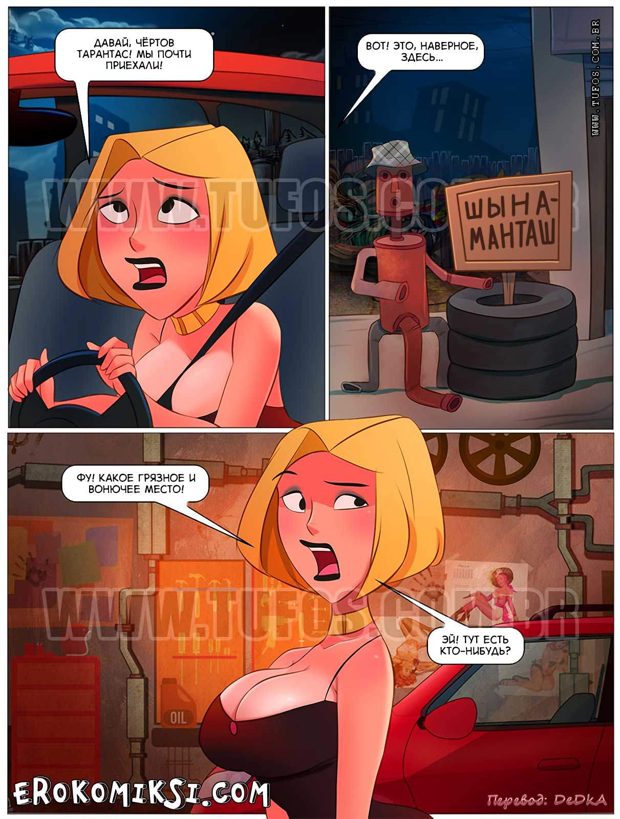 Сисястая дамочка приходит к своей роскошной тачке с кучей покупок и обнаруживает, что в машине пробито колесо. По мобильному приложению давалка обнаруживает неподалеку небольшую вонючую шиномонтажку. Оттуда выходит негр Пиконе, который соглашается помочь бедняжке. Девушку сразу заинтересовывает размер пениса Пиконе, виднеющийся из штанов. Шалава сама намекает на то, что хочет секса, а потому соглашается отсосать автослесарю хрен. Похоже, что автомастер обслужит не только колесо, но и саму дамочку.
