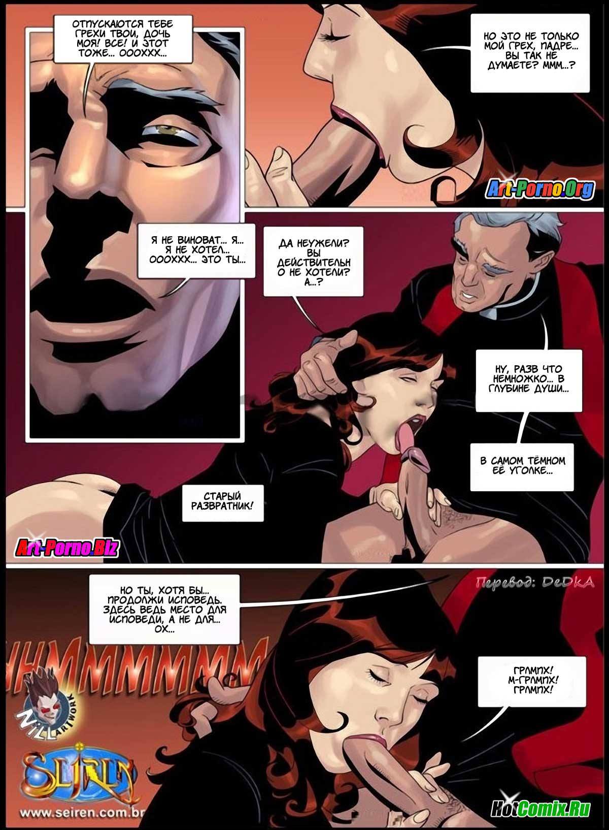 Трудно же приходится священникам. На исповеди им приходится слышать такие истории, от которых член встаёт крепче, чем от просмотра хорошего порно. Ну как можно было усмирить свою плоть, когда развратная шлюха рассказывала о том, как грешит с любым мужиком, который встречается ей на пути! А когда она замечает, что у святого отца встала шишка, опускается на колени и продолжает исповедоваться уже с полным ртом. В кабинках для исповедания так темно и тесно, совсем как в дырочке грешной шлюхи.