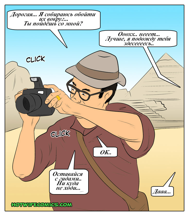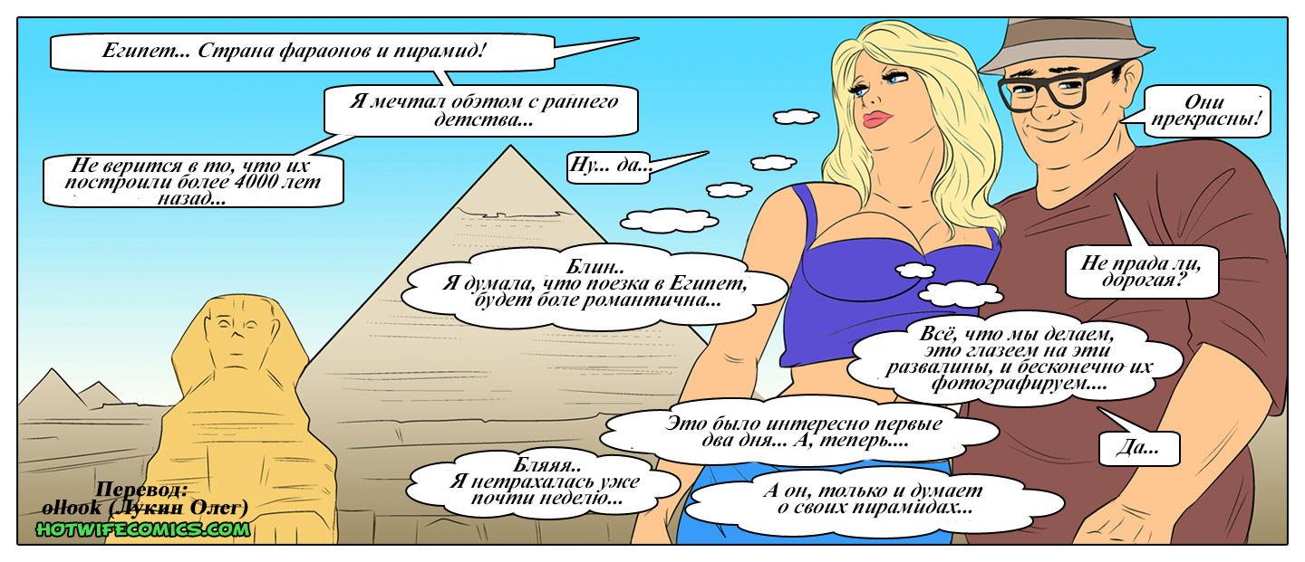 Сисястая бабенка-блондинка прилетела с очкастым бойфрендом в Египет, чтобы не только на пирамиды лупиться, а еще и активно сношаться, причем везде, где можно упасть. Трахалка бесится от того, что жирный очкарик любуется только развалинами, а прелести и округлости девушки его нисколько не привлекают. Красивая телочка соблазняется взглядами араба, который откровенно пялится, и пока муж на верблюде едет впереди и фоткает пирамиды, сучка активно трахается на втором верблюде прямо на ходу и на земле с изголодавшимся азиатом. А как насчет еще одного араба для групповушки?