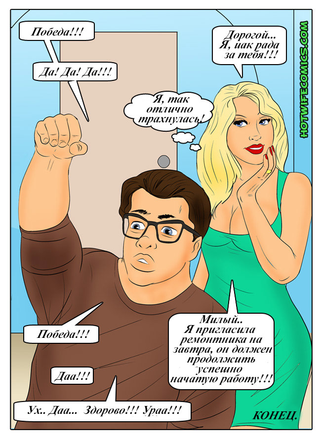 РемонтникРемонтник 06.11.2024 Комментарии Нет комментариев Sexwife, Секс комиксы Сисястая блондинка Ерика Куколхард сидит вместе с мужем в комнате и смотрит футбол, точнее делает вид только, что смотрит, потому как ей нахрен не нужен спорт, а только секс. Внезапно в дверь кто-то звонит, и Ерика идет, чтобы открыть дверь. Как развратница и предполагала, это вызванный ею заранее мастер по ремонту стиральных машин. Деваха проводит товарища в ванную, чтобы показать постоянно перегревающуюся стиралку, а заодно и свою изрядно изголодавшуюся киску. Сексапилка без проблем показывает розовую щелку, а дальше все идет, как сучка задумала. Комиксы по теме: Секс втроемМуж и его жена (сексапильная блондинка) не могут получить удовольствие от секса друг с другом… Месть через сексКлара каждый день мечтает о диком и необузданном сексе - не каждый мужчина способен дать… ДубляжПара молодых любовников трахается, предаваясь всевозможным ласкам. Вскоре к паре присоединяется матюра-брюнетка, которая просит любовников… Стейси - девушка ремонтник: часть 1Далекое будущее сулит мужчинам то, что нужда в них представительниц прекрасного пола практически отпадет. Для… Стейси - девушка ремонтник: часть 2Начальники порой накладывают на свои подчиненных такие обязанности, которые не просто невыполнимы для них, но… Стейси - девушка ремонтник: часть 5Скорость — это жизнь! Но кому мало скорости в повседневной жизни, тот наслаждается заездами болидов… Стейси - девушка ремонтник: часть 3Если человек не стремится к совершенству, тогда он никогда не станет лучшим работником месяца! И… Стейси - девушка ремонтник: часть 4Далеко не каждая девушка может похвастаться насыщенной сексуальной жизнью. Но одно дело — постоянно трахаться,… ↓↓↓ Ништячки! ↓↓↓ Поделись комиксом с друзьями! Как вам комикс? Оцените по 10-бальной шкале! (64 оценок, среднее: 7,67 из 10) Добавить комментарий Отменить ответВаш адрес email не будет опубликован. Обязательные поля помечены *Комментарий *Имя * Email * Сохранить моё имя, email и адрес сайта в этом браузере для последующих моих комментариев.