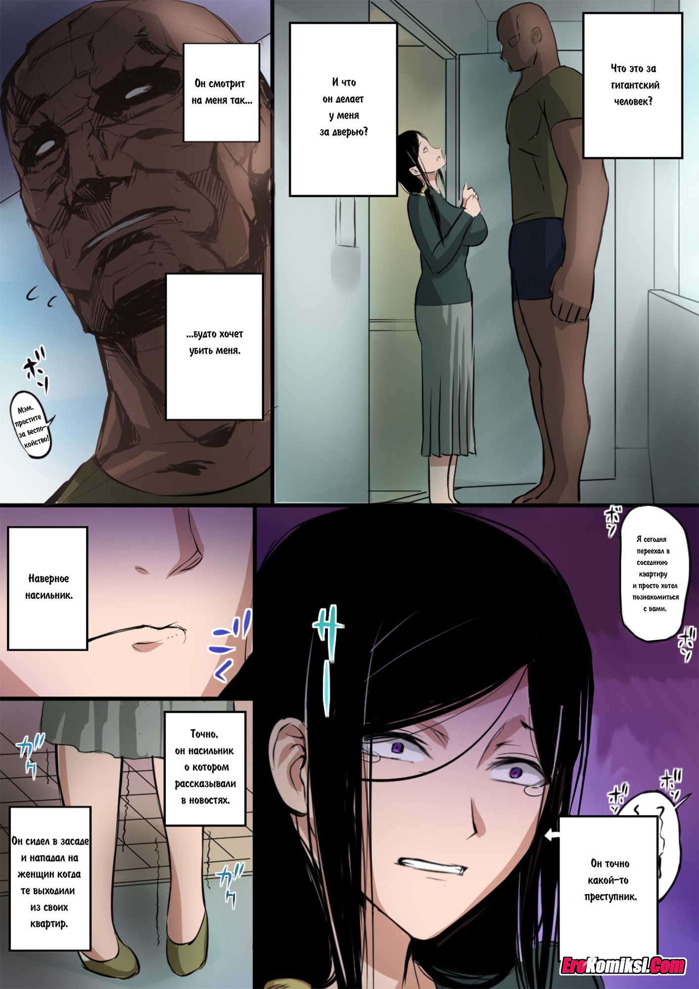 Девушка смотрела репортаж по телевидению, в котором рассказывалось, как маньяк поджидал женщин у дверей их квартир и трахал, пока никого не было рядом. Красотка настолько от этого разволновалась, что страшно захотела есть и поэтому пошла в магазин за едой. Как только она вышла за дверь, здесь же оказался какой-то гигантский здоровяк. Не говоря ни слова, он вытащил из штанов свой хер и стал совать красавице в рот. Такого количества спермы в ее ротике уже давно не было. И член чуть рот не порвал, но это было лишь начало!